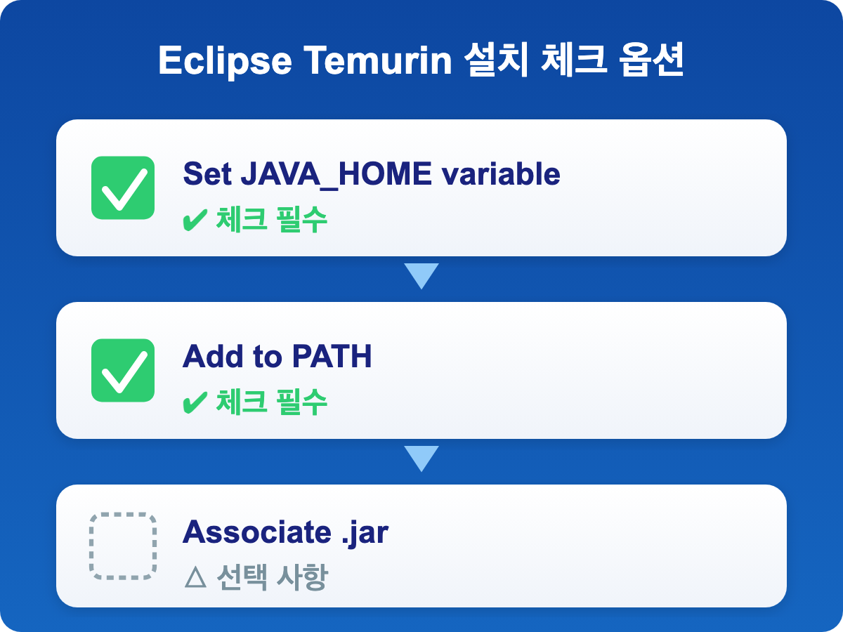 Temurin 설치 마법사에서 "Set JAVA_HOME variable"과 "Add to PATH" 옵션을 체크하면, 환경변수가 자동으로 설정됩니다. 이 옵션을 놓치면 다음 섹션의 수동 설정이 필요합니다.