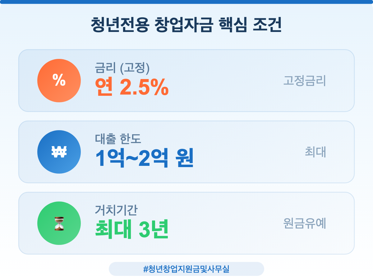직접 비교해봤는데, 시중 은행 청년 창업대출이 연 4~5%대인 것에 비하면 연 2.5% 고정은 정말 파격적입니다. 다만 예산이 정해져 있어 상반기에 소진되는 경우가 많으니 가능한 빨리 신청하세요.