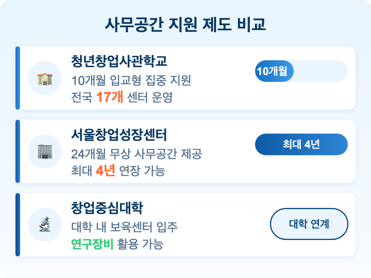 창업중심대학은 전국 6개 권역 11개 대학의 창업 인프라를 활용합니다. 대학 내 창업보육센터 사무공간과 연구장비를 이용할 수 있어, 특히 기술 기반 창업에 유리합니다.