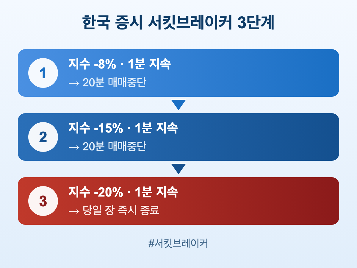 서킷브레이커는 코스피·코스닥이 -8/-15/-20% 하락 시 단계별로 발동되며, 1·2단계는 20분 매매중단, 3단계는 즉시 장 마감입니다. 09:05~14:50 사이에만 작동합니다.