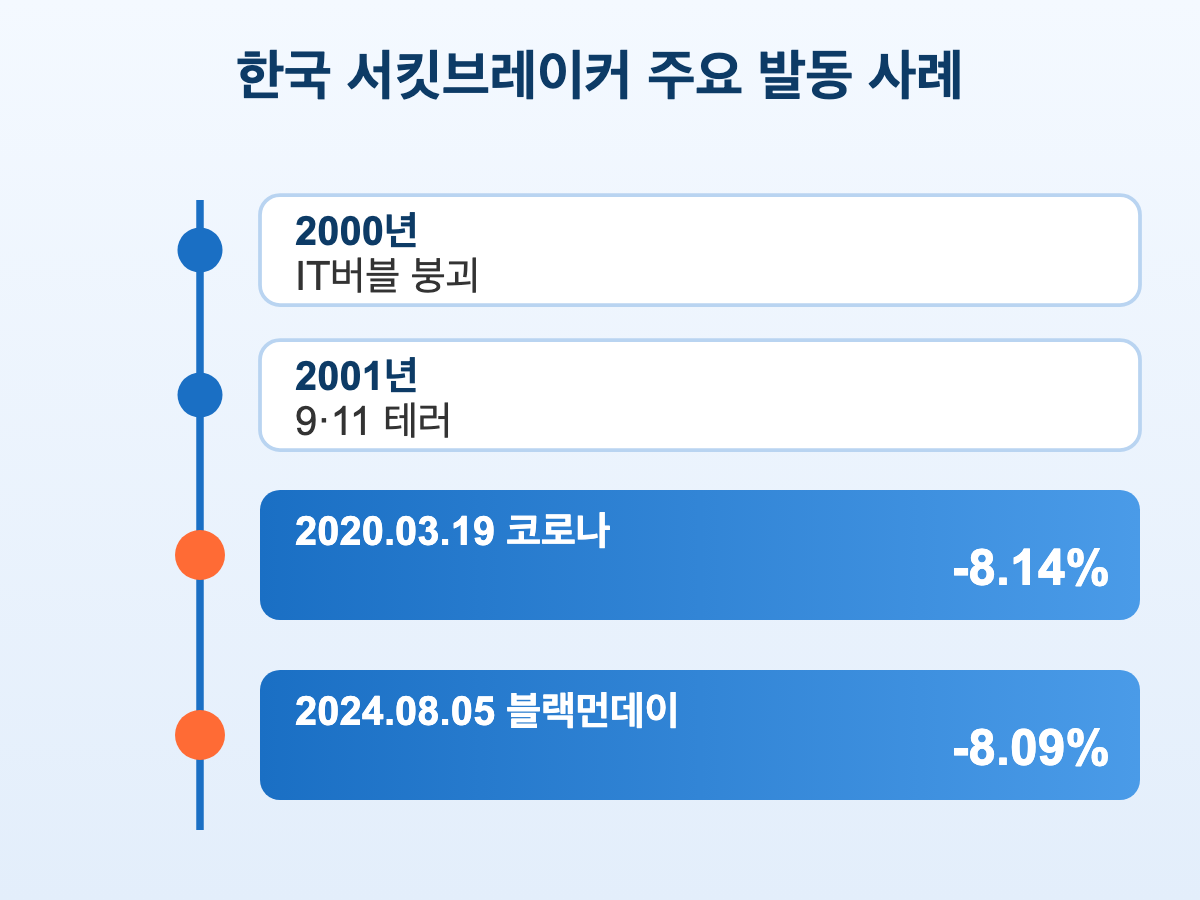 2024년 8월 5일은 코스피 시장 기준 역대 6번째 서킷브레이커 발동이었습니다. 2008년 금융위기 때도 발동되지 않았던 만큼, 한국 시장에서는 매우 드문 이벤트입니다.